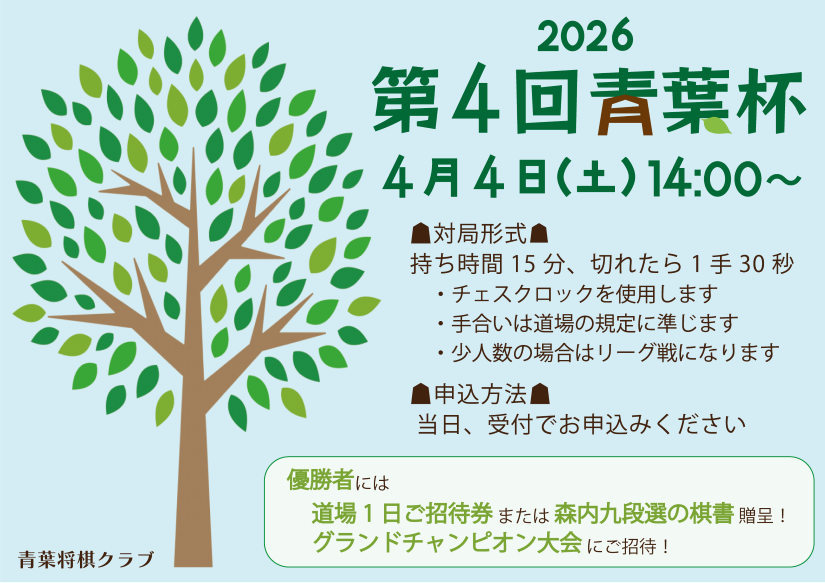 青葉将棋クラブ道場の大会は、2025年1月より「青葉杯」として